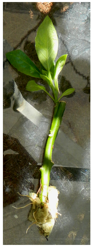 It was at this time I knew I needed to take some other plant cuttings before the sultry Florida weather brings on too much heat for me to do so. We'd had a bit of a wind storm the day prior, and while I was out gathering up the latest batch of cuttings, I saw a small, green branch had been snapped off of one of the brugmansia. What a pity I thought, it was beautiful growth, and I hated to lose it. But it was as green as the grass, no hint of hardening, so my heart sank. I was going to lose it for sure, no chance of rooting this up.