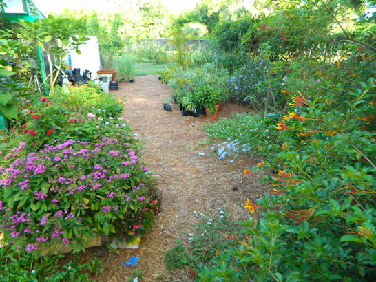 On the east side and what will be the edge of the new garden, is a large Firebush. I love this plant. It attracts every kind of butterfly with the sweet nectar hidden within the tubular flowers, and seems like it is constantly in bloom. I planted it about 4 years ago, from a 3 gallon pot bought at a local Big box store. So glad I did. It sprawls well over 6 feet at the base, and is as high as it is tall. Gino wants to trim it, I like leaving it wild, at least for now.