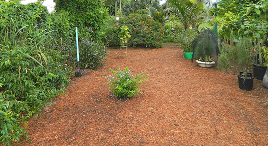 As mentioned, I already possess a nice sized Peanut Butter Bush, and so the main plants are all here and ready to be placed out. A 3 year old Mexican Flame Vine will be added, after I decide where to place a free-standing trellis to hold it. The dainty orange-yellow and black eyed daisy-like blooms are loved by small insects. That just leaves Gino to begin mulching up the pine needles to make us pine fines as a mulch. And of course, make those raised container beds.
