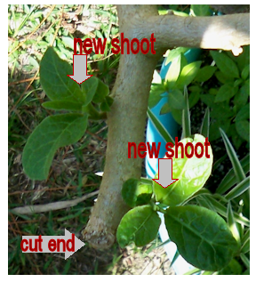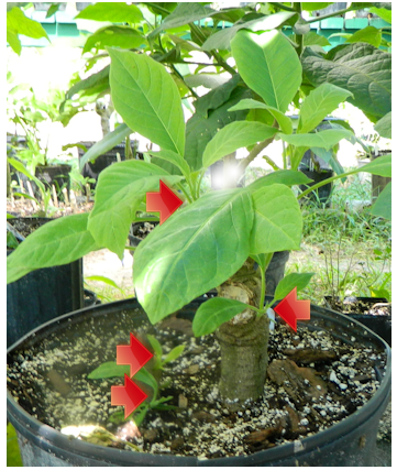 You can also prune a brugmansia all the way down to the vegetative growth stage on the trunk. Some people do this is if they want to bring the mother plant indoors in winter, but do not have a lot of room for all the branching out. Cutting the plant down this low on the trunk will result in multiple growing shoots along the main trunk, which will create a bushy shape. It may even spring up shoots from the underground, as shown by two of the arrows in the next picture.