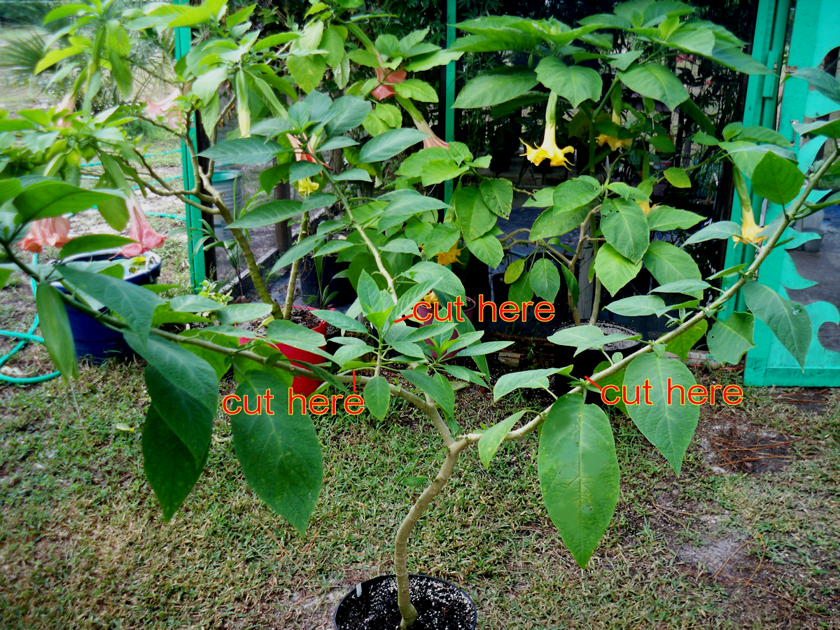 Tags: pruning a brugmansia, prune angel trumpet, angel trumpet pruning procedure, pruning angel trumpets, brugmansia pruning, prune brugmansia, y shapes in angels trumpets, standard tree form,