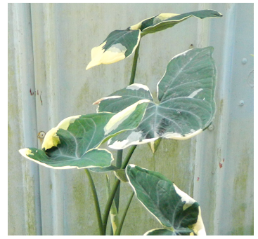 There is even a variegated version similar to the Stingray plant, called Alocasia Cucullata, with a bubbly lip and a thinner, more thread-like 'stinger'. It is hard to see the stinger in my photograph, but trust me, it's there. On Alocasia Cucullata, the leaf is complete, unlike the true Stingray plant.