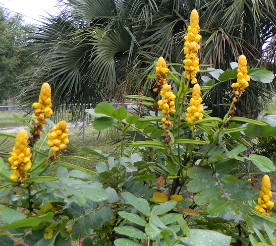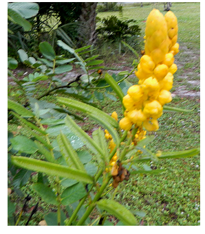 Candelabra bush is also a burtterfly attractor. The Giant Yellow Sulphur uses it not only for nectaring, but lays it's eggs on the plant. A few days later, lovely avocado and lemon striped caterpillars emerge. So if you like butterflies, this is another reason to try your hand at the lovely Senna Alata bush.