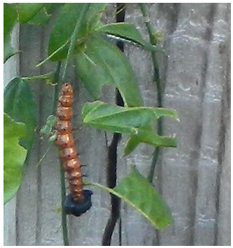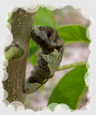 The caterpillar just beginning to turn into a chrysalis shown in above picture, that resembles bird dropping, is that of the Giant Swallowtail. Click here for more on the host plants used by this caterpillar.