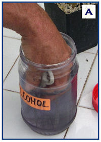 If you wish to save the extra anthers from this cultivar, now is the time to do it. Remember the pollen vials in Figure 1? Drop around 3 in the tube, and leave it uncapped but propped up so none of the pollen can spill. Throw away the stigma. After putting away the extra 3 anthers in the vial, and setting the two you will be using aside, dip your hands and the scissors in the alcohol. See Figure A. Dry all completely. You also have the potential to save all of the other anthers on the pod parent too, since you have sterilized your hands and the scissors and there is no possibility of cross contamination at this point.