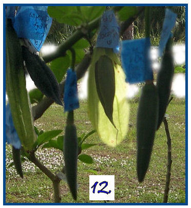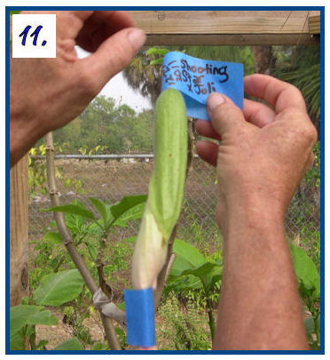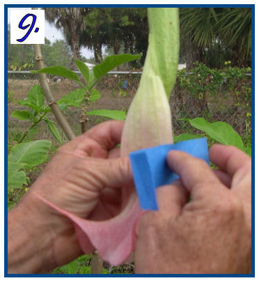 Notice when he has finally wrapped the last end of the tape in figure 10, he flattens it against the stigma and enclosed anthers. This will ensure that they are held in place long enough to pollinate the pod parent bloom.