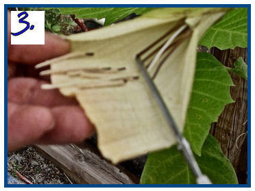 Brugmansia seeds can be harvested after the pod is ripe. The pods will easily slice open with an exacto knife, just run it down the pod length. The seeds should be plump, triangular in shape and brown. They may be a bit moist from the interior of the brugmansia seed pod, so separate them onto paper towels and allow to air dry a day or so. Then place them in paper packaging, similar to the postal packets. Alternatively, place them in plastic seed packets. Make sure to label the date of harvest, and the cross, with the mother plant listed first.