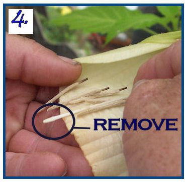 Step 4 You will now approach the pod parent flower and carefully slice her open the same way you did in Figure 2. Do not remove as much of the petal of this flower as you may have in the first flower. You will want to leave enough of it to cover the stigma when you are done. If you want to save the anthers from this flower, do it now, before handling the anthers of the pollen donor. Save them as told above. You will not need to resterilize your hands and scissors, as the only pollen you will be touching now will be crossed anyway and it won't matter if you accidentally touch them together. Be very careful when cutting this second flower, not to damage the stigma in any way! This is the part of the flower that will be saved and leads to the ovary! The stigma is attached to the style that you see circled in the photo above (figure 4) that says 'remove' DO NOT REMOVE it in the pod parent∼second flower!