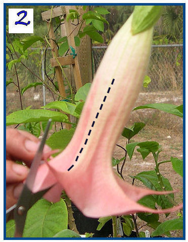 Step 2 After deciding, gently and carefully make a slice with the clean scissors along the outer wall of the pollen donor flower, slicing as far up as you need to. You are attempting to expose the anthers of the flower. Depending upon the cultivar, the stigma may or may not be below the anthers. See figure 2 for an example of the cut, should be at your right. (anthers are shown in figure 5.) Some cultivars will have them higher up, and you will need to cut even higher than the dotted lines.